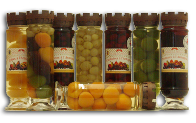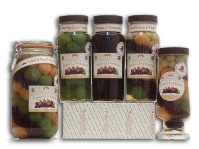 Cocktail de fruits à l’ArmagnacCet assemblage est réalisé avec des Pruneaux, des Prunes vertes, des Abricots et des raisins. Nous les arrangeons dans les bocaux en spirale pour les 3 premiers fruits pour finir par un bouquet de raisins. Ils seront consommés seuls, en les incorporant dans une salade de fruits, en accompagnement d’un cake,…